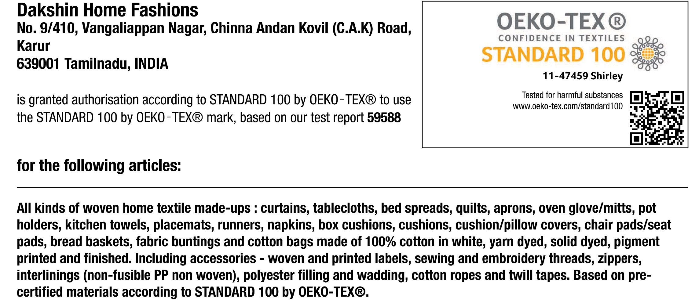 Dakshin was able to achieve this with only Customers in mind and providing them a peace of mind when it comes in High Quality Products We are proud that Dakshin is one of the very few companies in our field to have Oeko Tex Certified products.